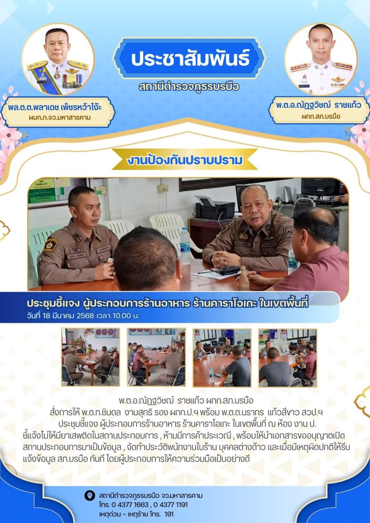 พ.ต.อ.ณัฏฐวิชฌ์ ราชแก้ว ผกก.สภ.บรบือ สั่งการให้ พ.ต.ท.ชินดล งามสุทธิ รอง ผกก.ปฯ พร้อม พ.ต.ต.นรากร แก้วสีขาว สวป.ฯ ประชุมชี้แจงสถานประกอบการ ร้านคาราโอเกะ ในเขตพื้นที่ ณ ห้องงาน ป.