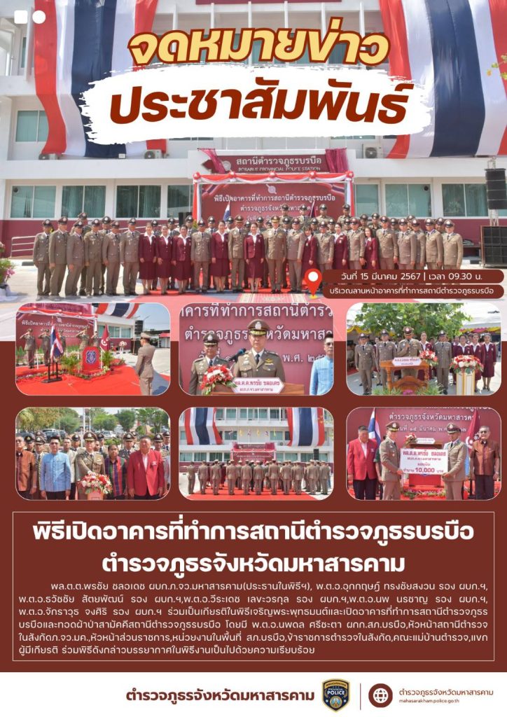 พล.ต.ต.พรชัย ชลอเดช ผบก.ภ.จว.มหาสารคาม (ประธานในพิธีฯ) , พ.ต.อ.อุกกฤษฎ์ ทรงชัยสงวน รอง ผบก.ฯ, พ.ต.อ.ธวัชชัย สัตยพัฒน์ รอง ผบก.ฯ, พ.ต.อ.วีระเดช เลขะวรกุล รอง ผบก.ฯ, พ.ต.อ.นพ นรชาญ รอง ผบก.ฯ, พ.ต.อ.จักราวุธ จงศิริ รอง ผบก.ฯ ร่วมเป็นเกียรติในพิธีเจริญพระพุทธมนต์และเปิดอาคารที่ทำการสถานีตำรวจภูธรบรบือและทอดผ้าป่าสามัคคีสถานีตำรวจภูธรบรบือ โดยมี พ.ต.อ.นพดล ศรีชะตา ผกก.สภ.บรบือ, หัวหน้าสถานีตำรวจในสังกัด ภ.จว.มค, หัวหน้าส่วนราชการ, หน่วยงานในพื้นที่ สภ.บรบือ,พ.ต.ท.หญิง พรยุพา โนนตาไทย รอง ผกก.ฯ ปรก.ภ.จว.มหาสารคาม, พ.ต.ท.หญิง รัชนี วิริยะ สว.ฝอ.ภ.จว.มหาสารคาม,พ.ต.ท.จำรัส เกตุแสง สว.สส.ฯ ปรก.ภ.จว.มหาสารคาม,ข้าราชการตำรวจ สภ.บรบือ, คณะแม่บ้านตำรวจ,แขกผู้มีเกียรติ ร่วมพิธีดังกล่าว บรรยากาศในพิธีงานเป็นไปด้วยความเรียบร้อย