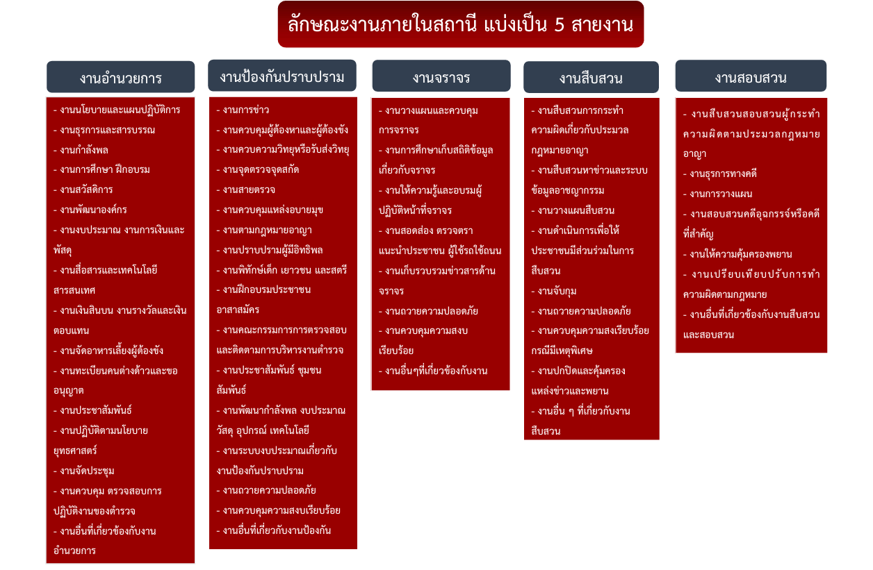 - ปฏิบัติการอื่นใดตามที่กฎหมายกำหนดให้เป็นหน้าที่ของตำรวจหรือสำนักงานตำรวจแห่งชาติ